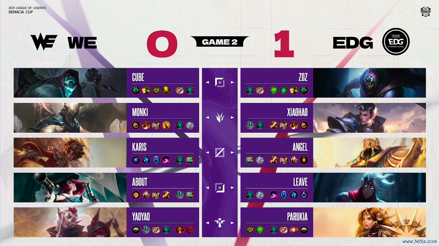 第一局比赛,EDG蓝色方,禁用:韦鲁斯、兰博、辛德拉、女枪、厄斐琉斯,遴选:Zdz鳄鱼、Xiaohao莉莉娅、Angel发条、Leave卡莎、Parukia芮尔;WE红色方,禁用:杰斯、妮蔻、芸阿娜、塞拉斯、巨魔,遴选:Cube奎桑提、Monki石头东说念主、Karis阿卡丽、About希维尔、yaoyao毒头