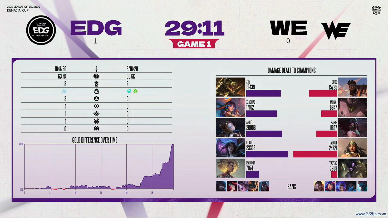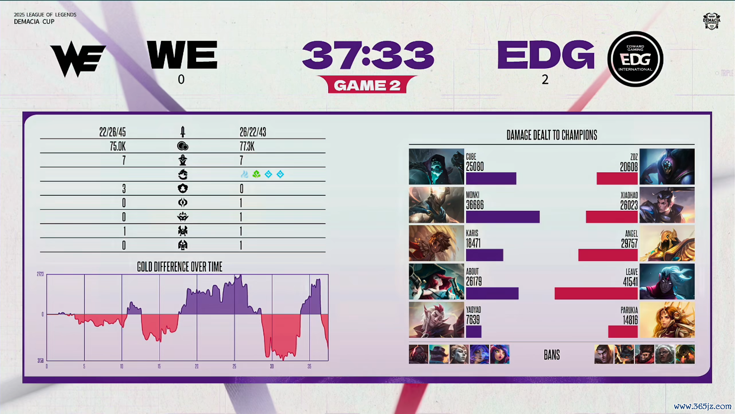 恶果第一局比赛,EDG打出了片面的碾压局。前15分钟,两队打得比拟严慎,经济几经回转;17分钟傍边:毒头石头双击飞谐和,WE击杀三东说念主拿下小龙;24分钟傍边:Leave卡莎大肆输出,鳄鱼莉莉娅完成收割EDG打出2换4;26分钟傍边:EDG再次赢团击杀三东说念主,并趁势拿下大龙;最终29分11秒,EDG团灭WE,先赢一局!